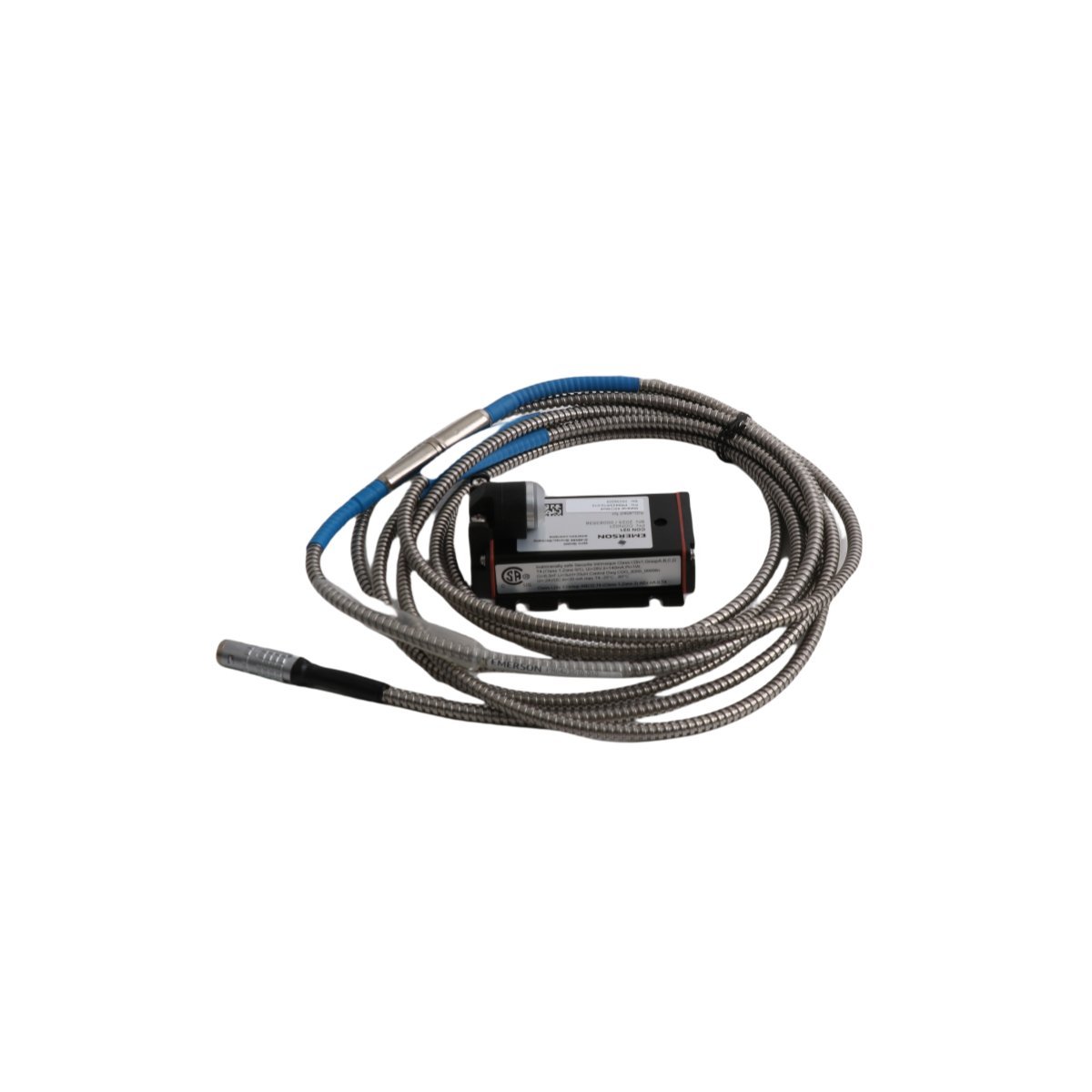 The Emerson PR6423/010-010 CON021 is a non-contact eddy current sensor featuring an 8mm tip for precise displacement and vibration monitoring in industrial rotating machinery.