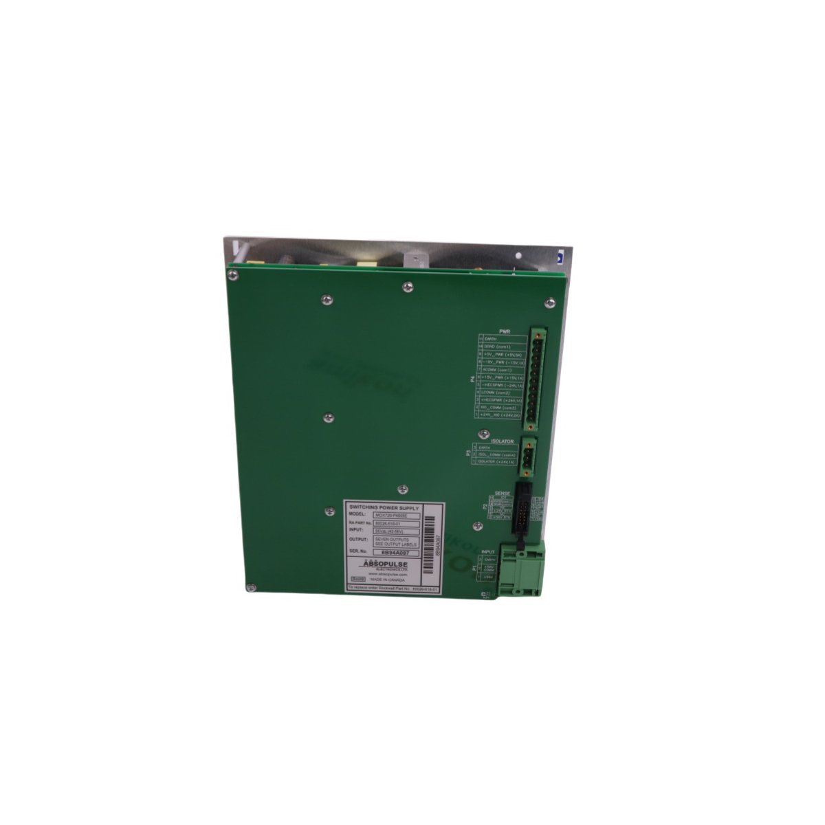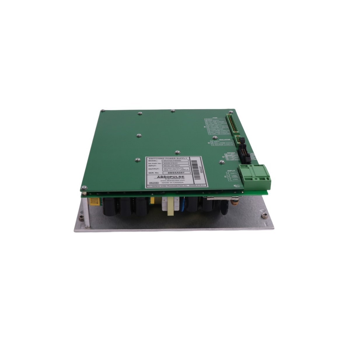 The Allen-Bradley MOX720-P4668E (80026-518-01) is a specialized industrial switching power supply that converts a 56VDC input into three regulated DC outputs. It provides high-efficiency power distribution for complex PLC systems and OEM automation machinery.